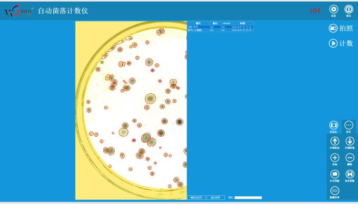 3、一鍵拍照自動計數(shù)精度≥96.5%,極少修正后可達100%正確。分析速度:50~500個菌落/s(計數(shù)分析耗時1~4秒)。對顯色培養(yǎng)基培養(yǎng)出來的大腸桿菌群也能有效自動計數(shù)??勺詣幼R別計數(shù)≥0.1mm的菌落。