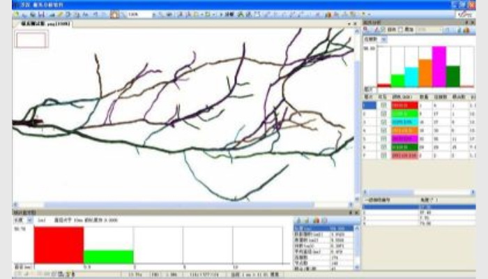 (11)能進(jìn)行根系的顏色分析,確定出根系存活數(shù)量,輸出不同顏色根系的直徑、長度、投影面積、表面積、體積。