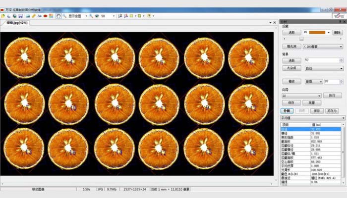 (4)可同時(shí)測(cè)量30只柑橘類水果的:縱徑、橫徑、果形指數(shù)、總面積、皮厚、肉色分檔分析、外周長(zhǎng)。