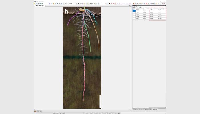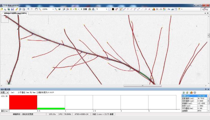(11)能進(jìn)行根系的顏色分析,確定出根系存活數(shù)量,輸出不同顏色根系的直徑、長(zhǎng)度、投影面積、表面積、體積。